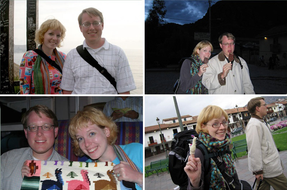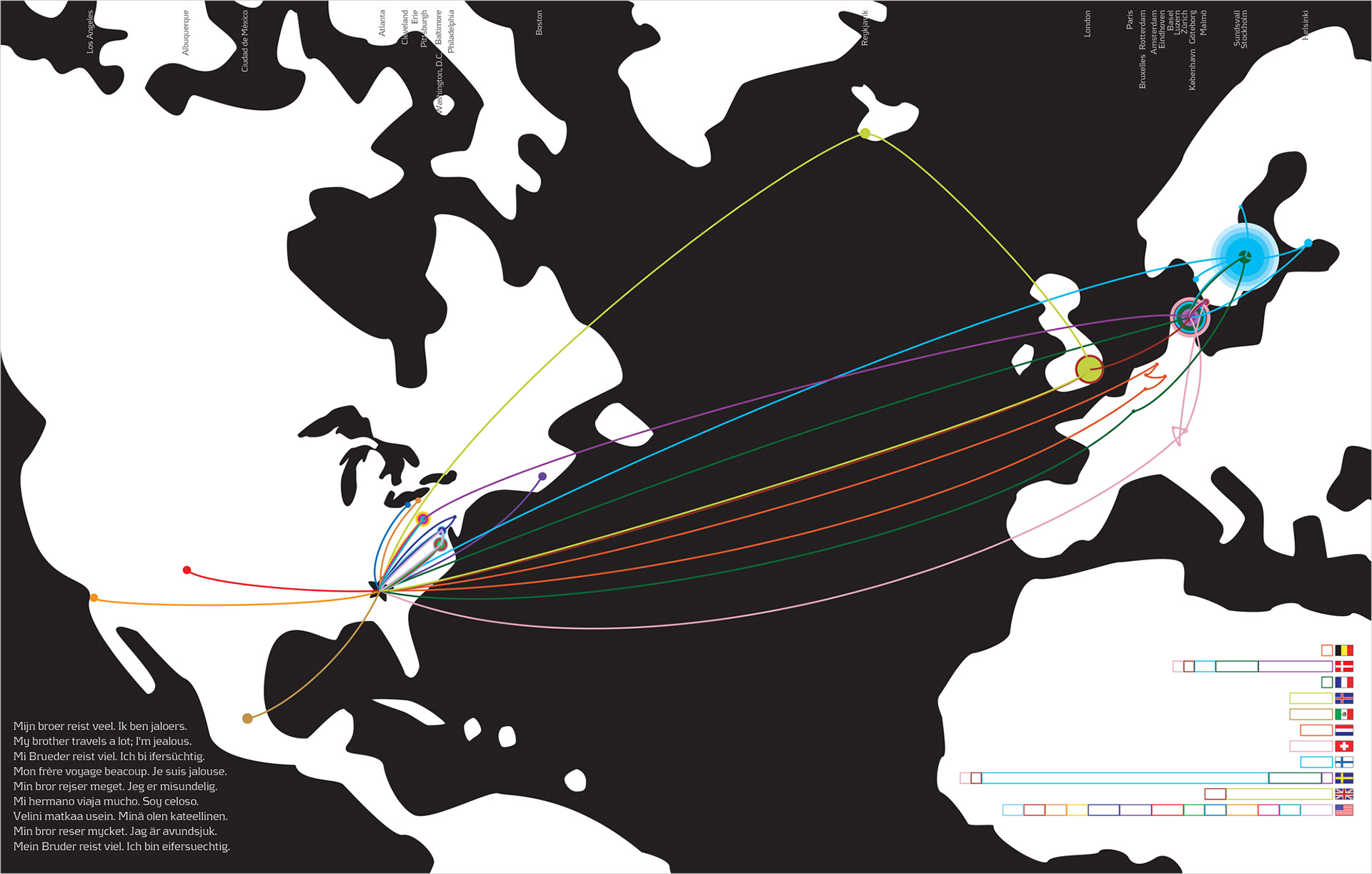 After graduating from university, my brother spent 17% of the next two years travelling, and I decided to create a poster of his travels. Colour corresponds to each of his 21 trips, and size corresponds to the amount of time spent at each place. Different values of the same hue mean that he visited a city more than once during that particular trip. This is most noticeable on Stockholm because he spent a month there, but he went on various weekend and day trips, always returning to Stockholm.