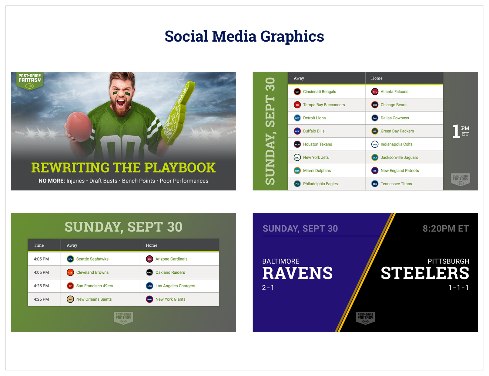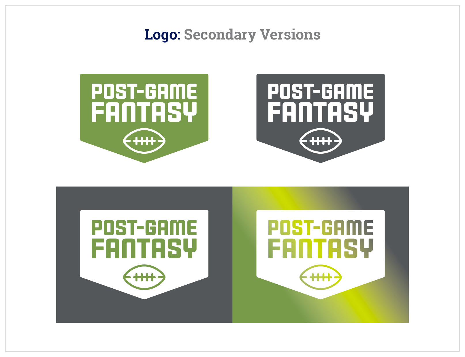 Post-Game Fantasy is a wholly new type of fantasy football in which you select your weekly line-up after the games are played each week. The catch? You can only select each player once throughout the entire season. Post-Game Fantasy wanted their visual identity to feel fun and appeal to football-loving, tech-savvy risk-takers.